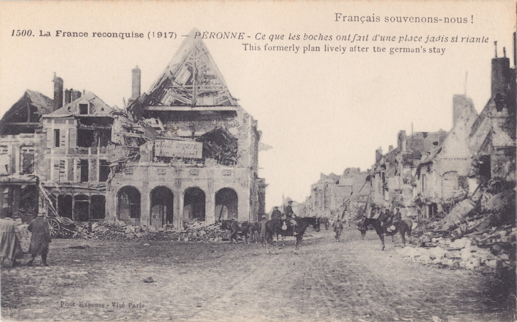 | Légende principale | 1500. La France reconquise (1917) - PÉRONNE - ce que les boches ont fait d'une place jadis si riante. This formerly plan lively after the german's stay Français souvenons-nous ! |
