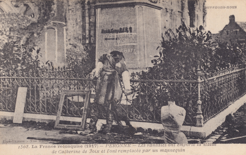 | Légende principale | 1502. La France reconquise (1917) - PÉRONNE - Les vandales ont emporté la statue de Catherine de Foix et l'ont remplacée par un mannequin Français souvenons-nous |